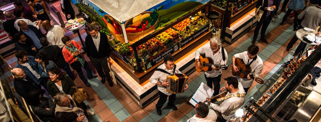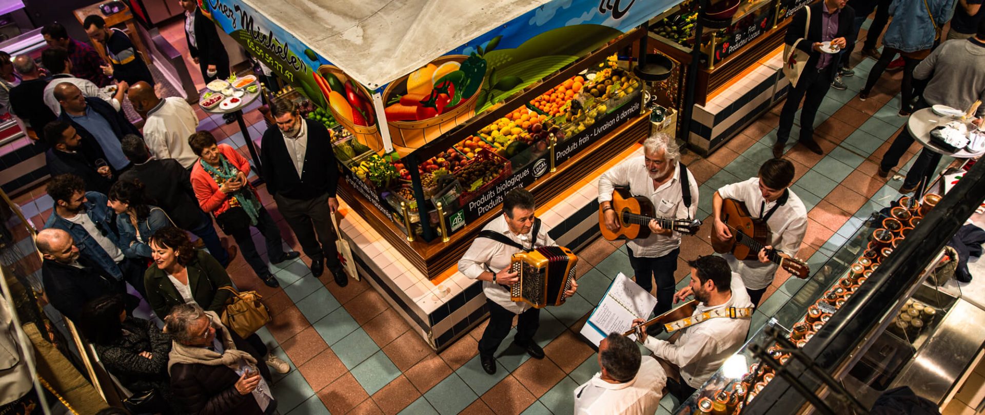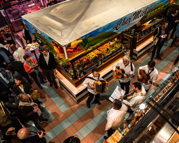 L’ambiance est rythmée par un trio de chanteurs basques et les Halles sont décorées pour l’occasion.