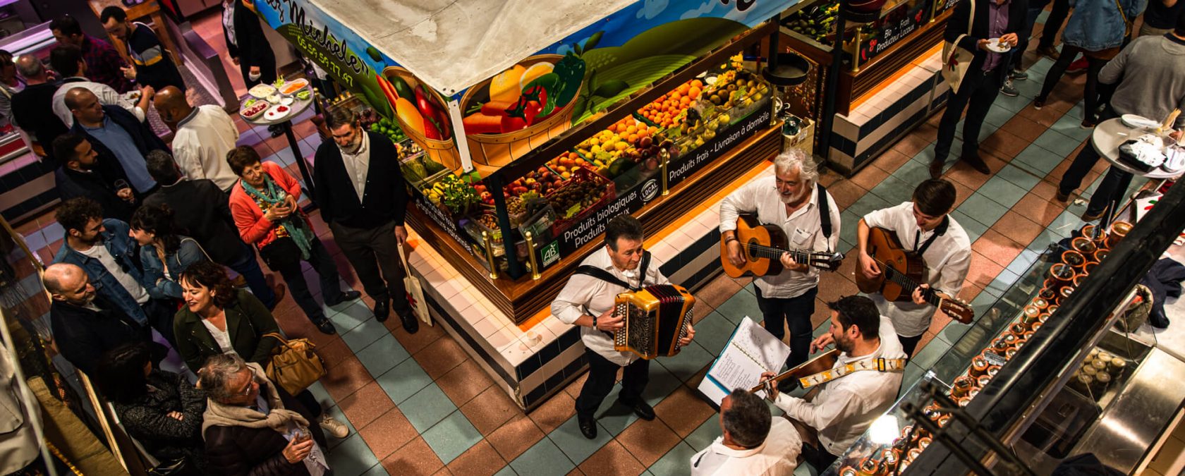 De 19h30 à 23h30, vos invités profitent d’un accueil chaleureux autour d’un verre de sangria ou de champagne, avant de découvrir librement les différents stands tenus par les commerçants des Halles : poissons, charcuteries locales, fromages, taloak, pâtisseries…